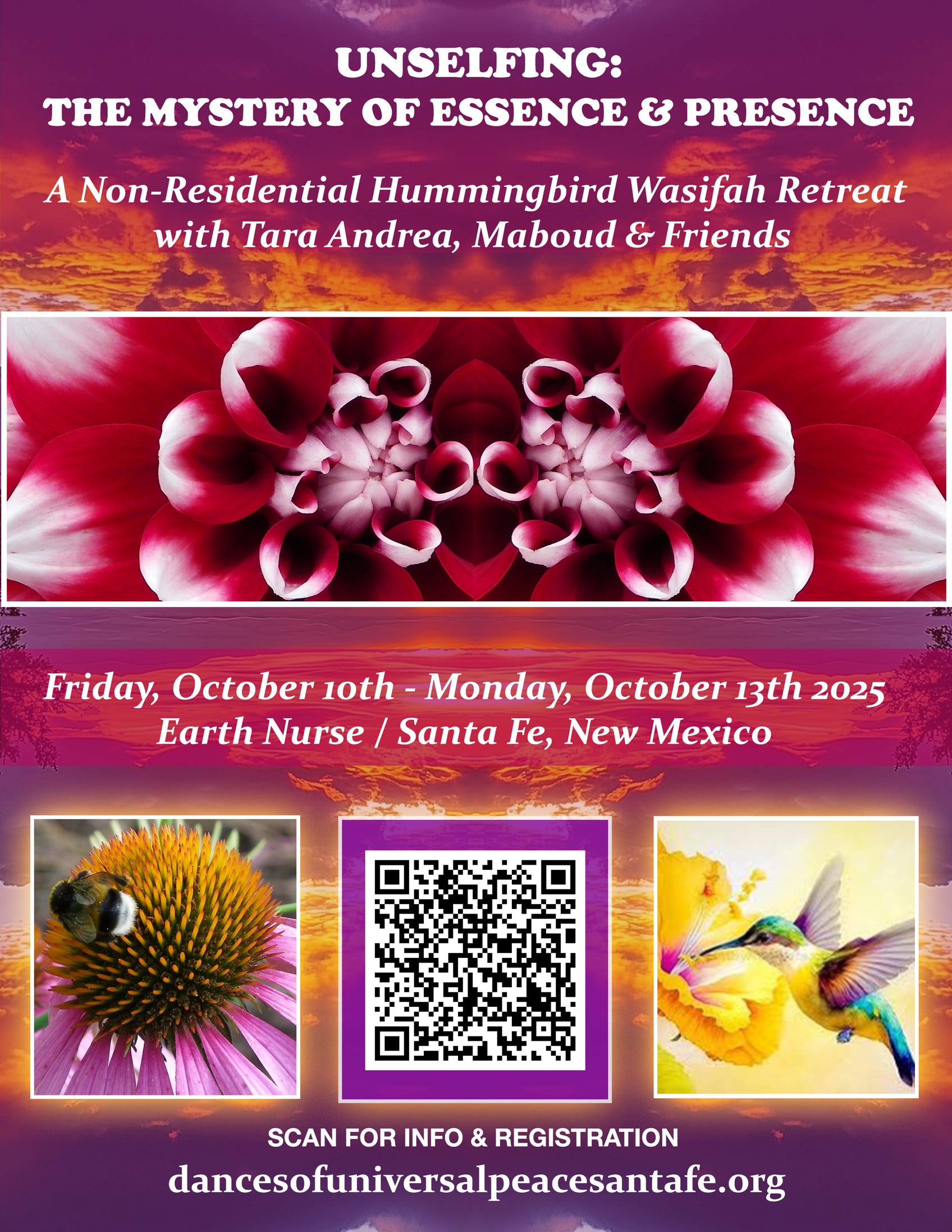 Some creative activities may include: Original Wasifa Dances, Dances of Universal Peace, Silent & Guided Meditations, Art, Poetry & Constellation Group Process, and sharing of our life experiences of unselfing, budding and blossoming.